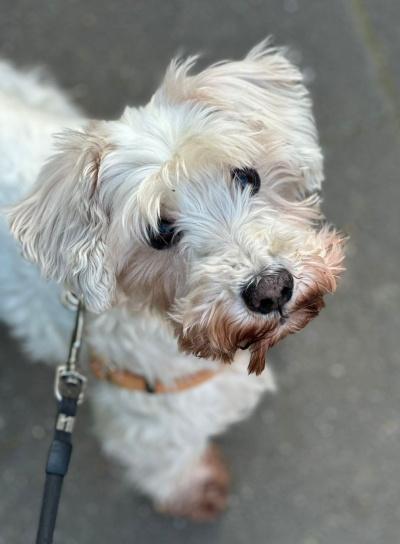 Richy ist ein weißer Zwergschnauzer, der ursprünglich aus der Ukraine kommt.